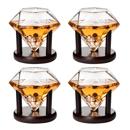 Set of 4 Diamond Whiskey & Wine Glasses With Wood Stands 10oz - Wine, Whiskey, Water, Diamond Shaped, Diamonds Collection Sparkle Patented Wine Savant - Stands Alone, Or on Stand