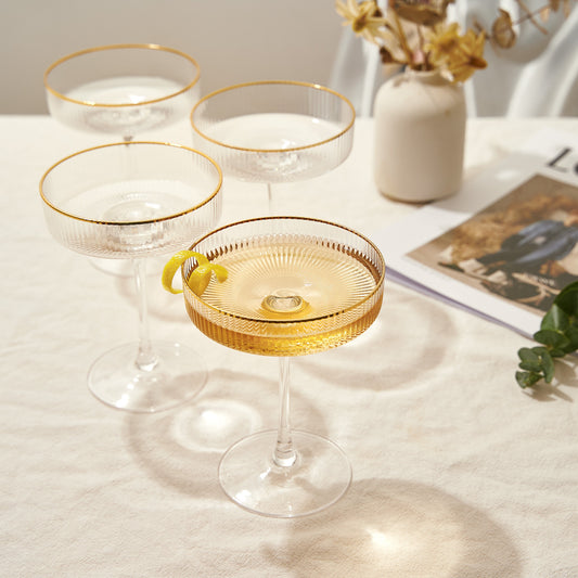 Ribbed Coupe Cocktail Glasses With Gold Rim 8 oz | Set of 4 | Classic Manhattan Glasses For Cocktails, Champagne Coupe, Ripple Coupe Glasses, Art Deco Gatsby Vintage, Crystal with Stems