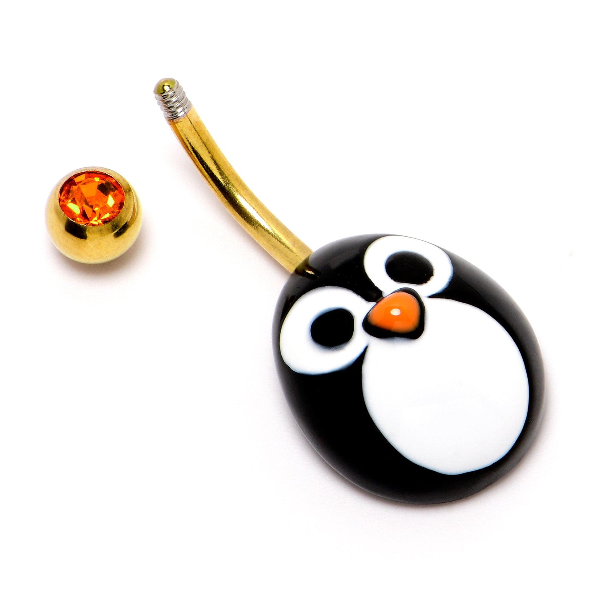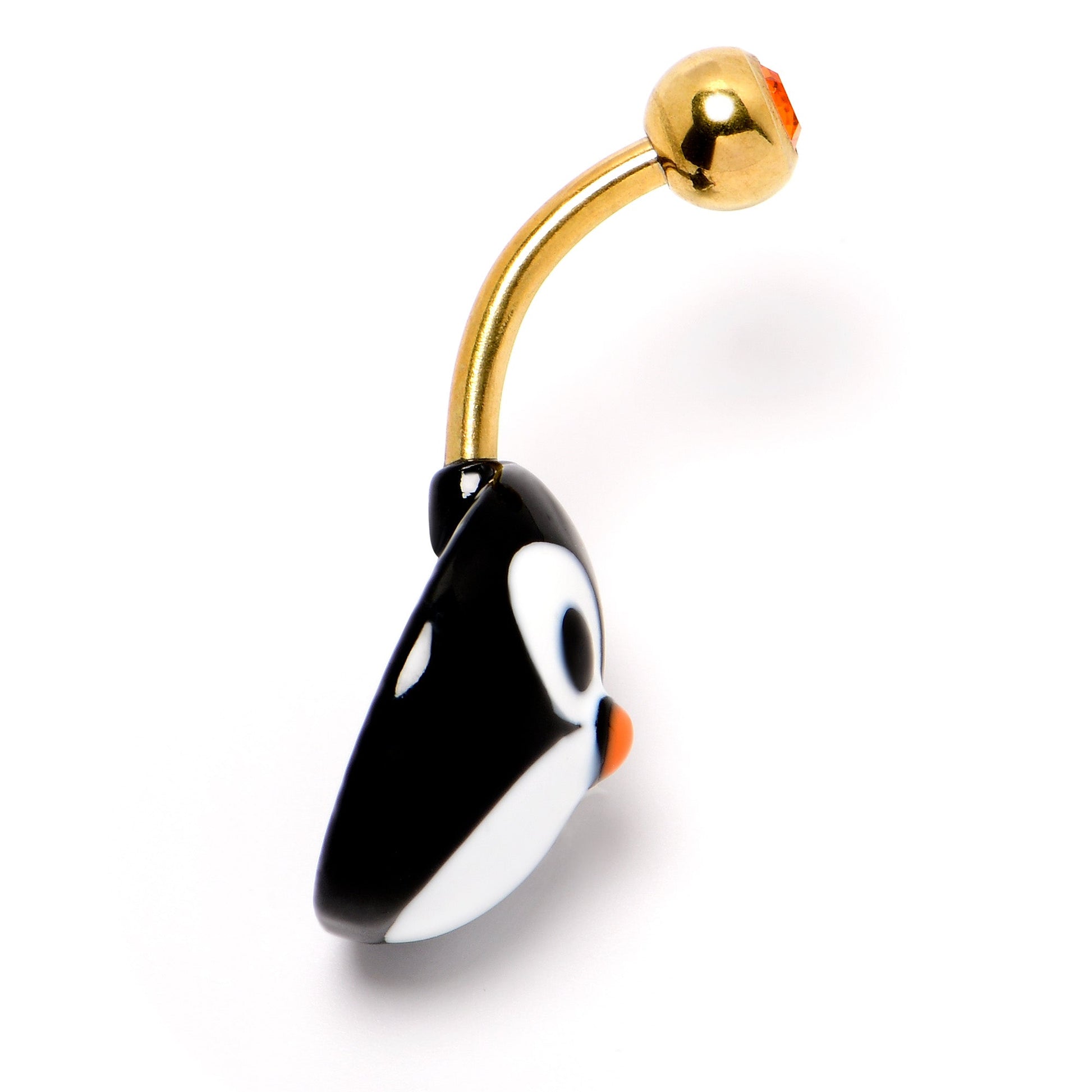 Talk about cute when you're rocking this 14 gauge navel ring! It's made with a 3/8" gold tone PVD over 316L surgical grade stainless steel curved barbell with a 5mm top ball end, which is set with a red gem. The bottom end features a round penguin charm. The penguin features its face in simple, geometrically styled detailing, with wide eyes and a bright orange beak. You'll be ready to march into the winter holidays in sweet style with this awesome, avian belly piercing jewelry!