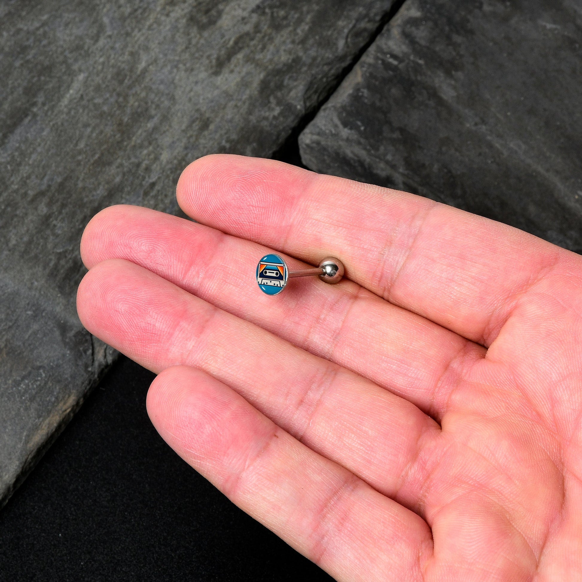 Capture the music and the moment with this retro 14 gauge tongue jewelry! It's made with a 5/8" durable 316L surgical grade stainless steel straight barbell with a 5mm bottom ball end. The disc-shaped top end is blue and features a cassette tape charm. This 80's flashback features a white body and colorful detailing in the corners for maximum impact. Grab your boombox and get ready to rock with this wonderfully retro tongue piercing ring!
