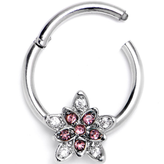 16G 3/8 Pink Clear CZ Gem Snowflake Flower Hinged Segment Ring