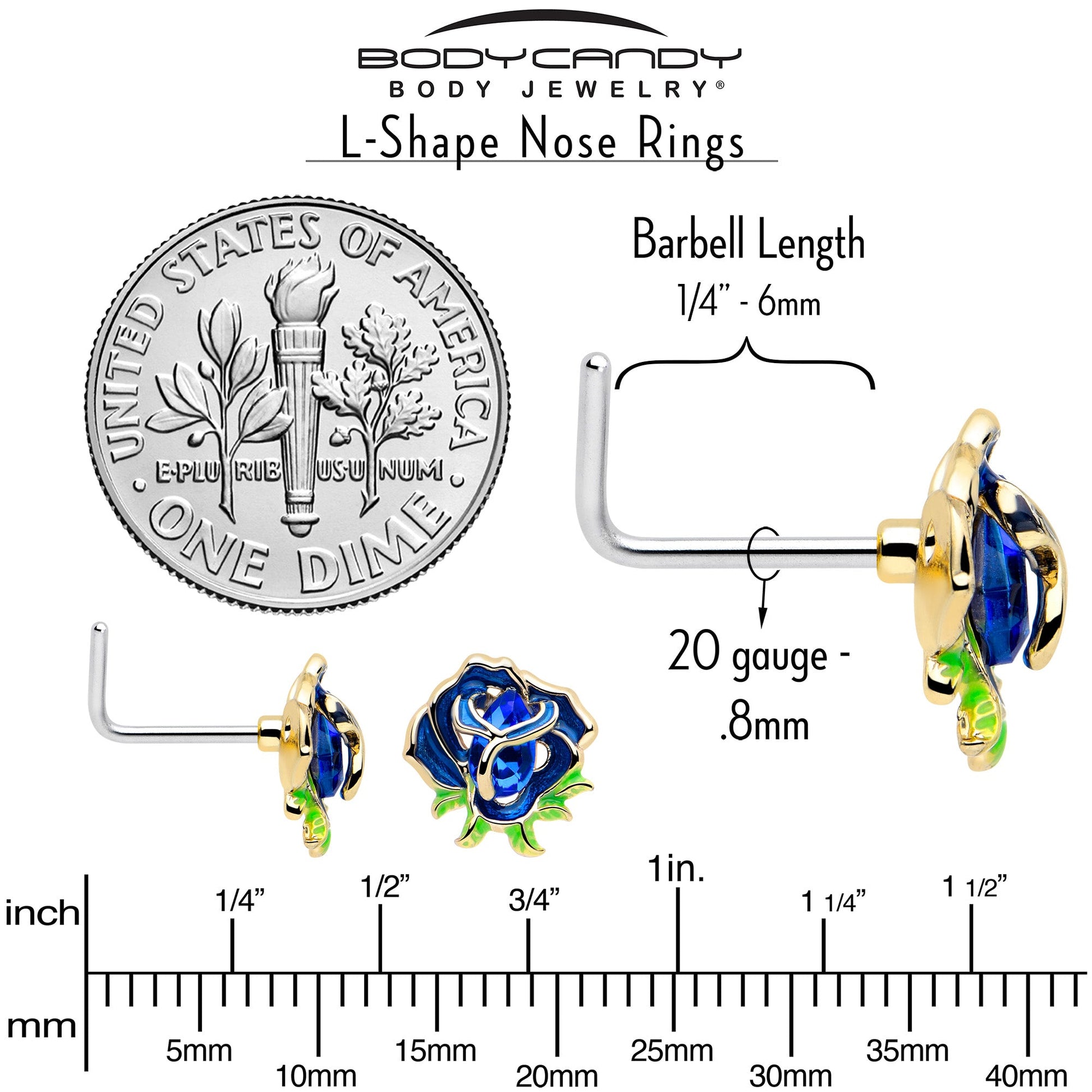 Dive into the depths of style with this 20 gauge nostril ring. It's made with a 0.27 inch length at the bend 316L surgical grade stainless steel L-shaped post. It features a flower charm, inlaid in the deepest of blues. It is further embellished with a matching deep blue gem center and green leafy detailing at the bottom. Get the blues in the best way possible with this fabulous floral flower nose piercing jewelry.Specifications