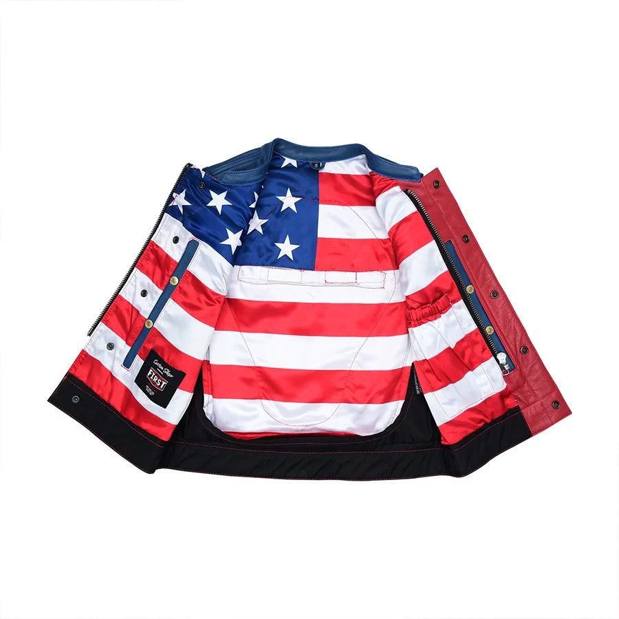Ride in style and confidence with freedom belle women motorcycle leather vest, crafted from premium 1.1mm cow diamond red leather on the front, back, and bottom. Cow Diamond White accents on the chest flaps & slash pockets, with a bold Navy Blue top for contrast. It features a sleek band collar with covered snaps, hidden cropped zipper, and durable YKK hardware. Functional details include two snap-down chest pockets, two slash pockets, dual conceal carry pockets, and a cell phone pocket for easy access on every ride. The U-shape back zipper allows effortless patch customization, while the three-panel satin USA flag lining gives it a standout finish. With CE-rated armor pockets for protection, this vest delivers the perfect blend of biker attitude, comfort, and road-ready performance.