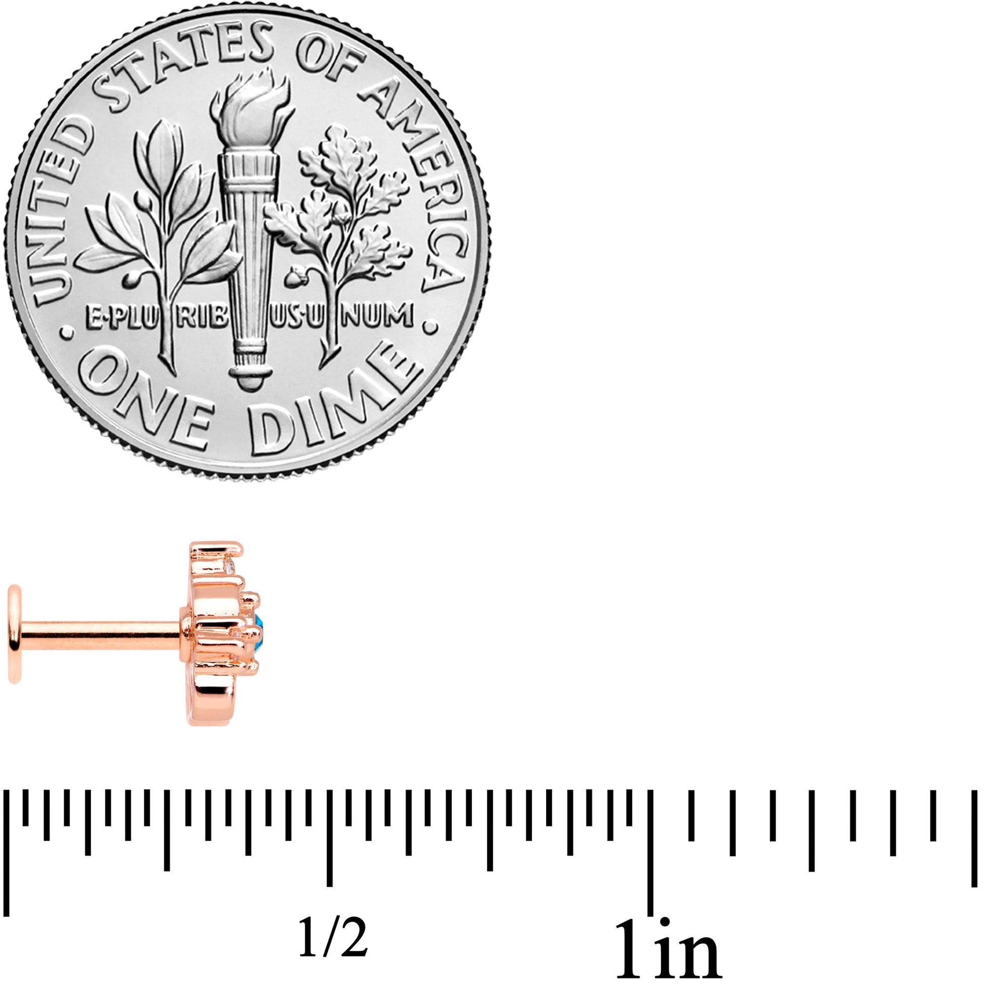 Wear your love with grace and style with this elegant 16 gauge cartilage jewelry! It's made with a 6mm rose gold tone PVD over 316L surgical grade stainless steel straight barbell with a flat disc end. It features a hollow heart charm, set with a blue gem at the center and surrounded by three clear gems. At the base are graceful, swooping embellishments for a look that's subtle but super stylish. You can even rock this heart in multiple piercings including tragus, helix, and some conch piercings. Let your love adorn you cartilage piercings with this gracefully elegant heart labret!
