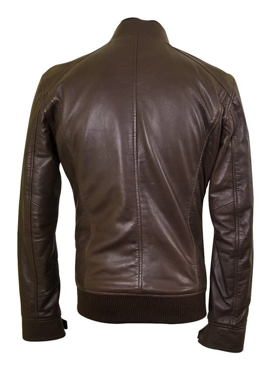 Handmade Brown Leather Jacket With Straight Ribbed Collar, Cuffs And Hem