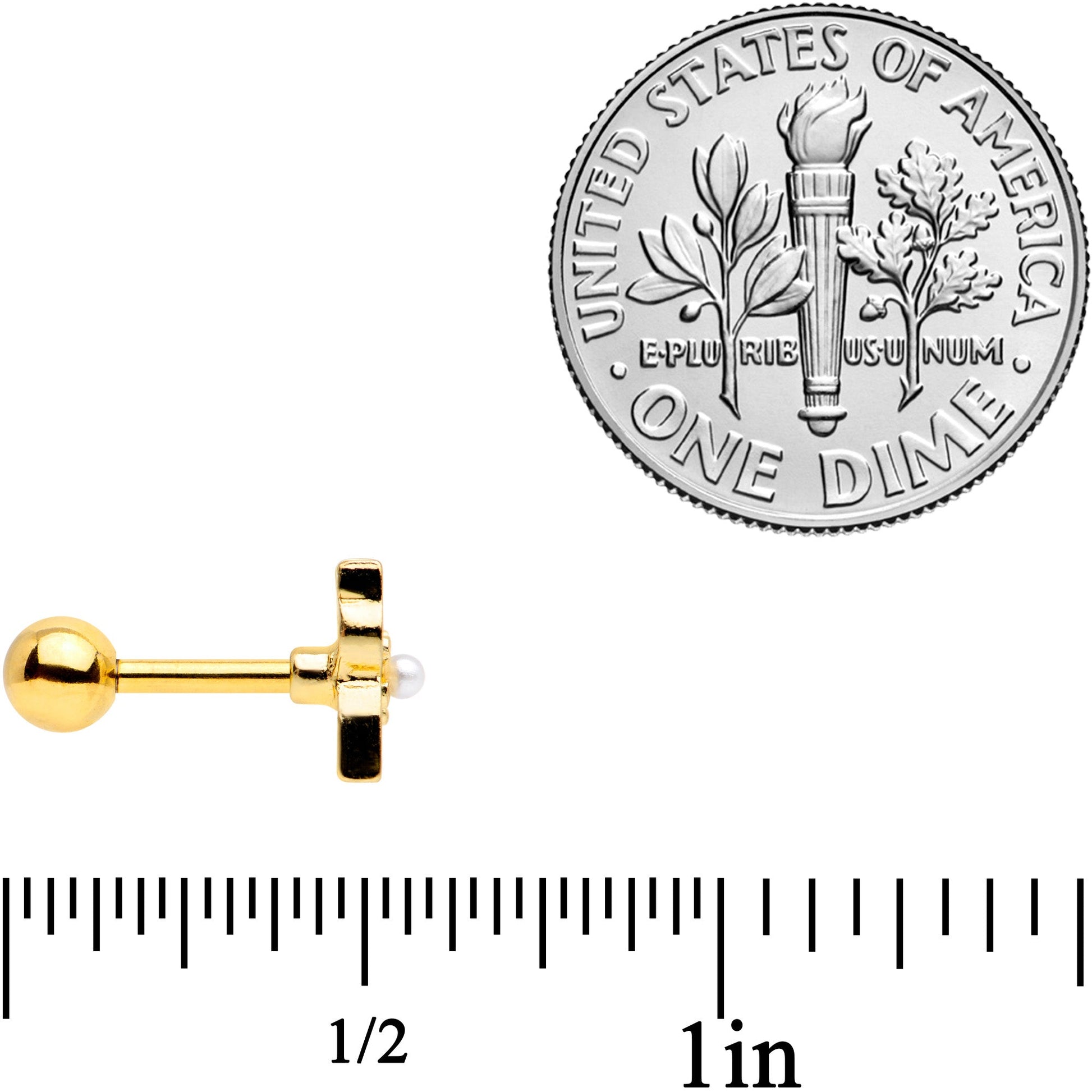 This little kitty is ready for its dinner! This 16 gauge cartilage jewelry is made with a 6mm gold tone PVD over 316L surgical grade stainless steel straight barbell with a 4mm ball end. It features the patient black pussycat charm holding a small white flower with its tail. The flower has a small white orb at the center, adding a charming touch of extra detail. And because kitties have been known to roam, this earring works in multiple cartilage piercings including the tragus, helix and conch. The overall look is upscale, but whimsical and has a subtly retro feel to it. You won't have to fish for compliments when you're wearing this in your tragus stud!Specifications