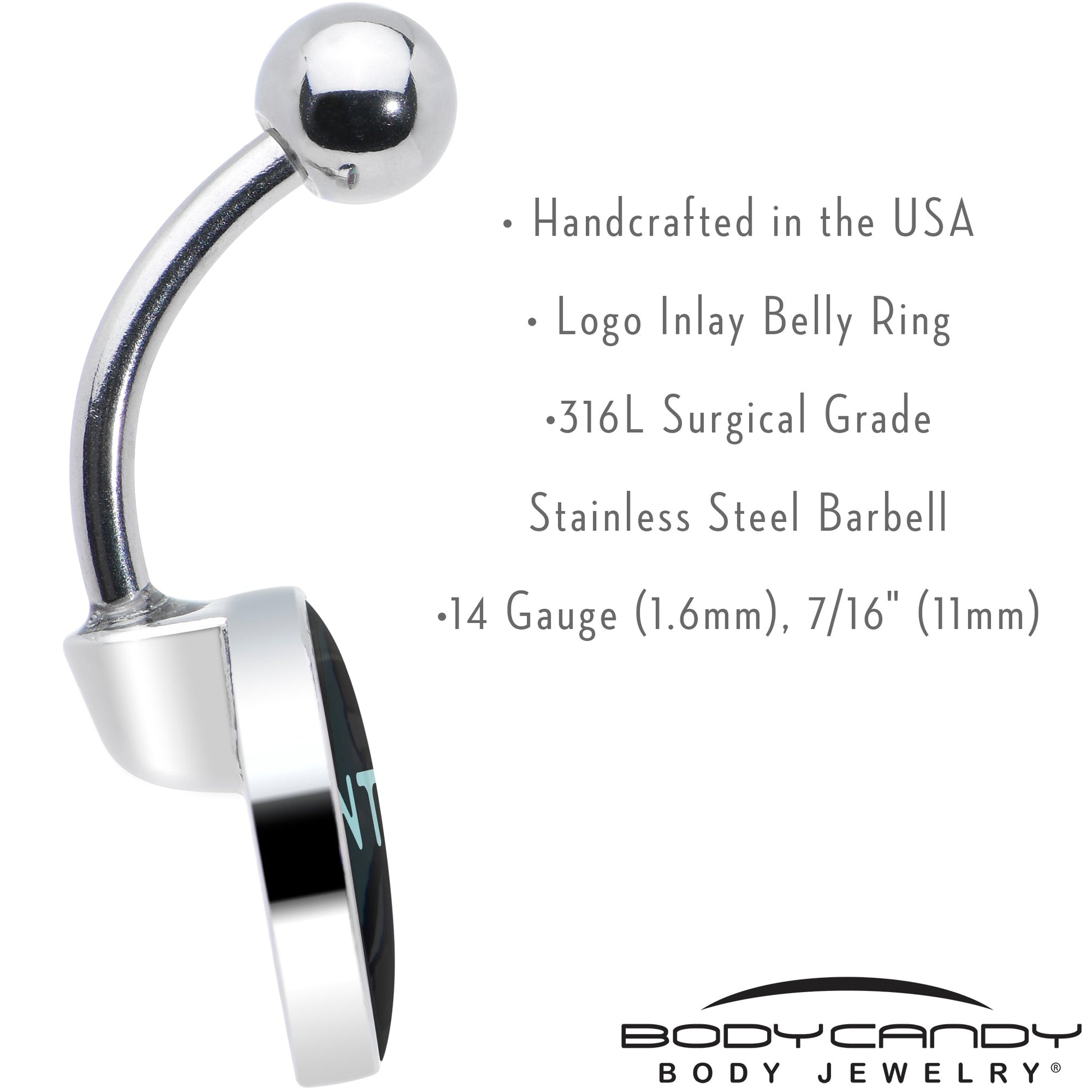 Say what you mean and mean what you say with this 14 gauge navel ring. It is made with a 7/16 inch 316L surgical grade stainless steel curved barbell with a 5mm top ball end. The bottom end features a disc shaped charm that features a logo inlay of a black background with a blue CVNTY message. Let the world know when to stay away with this charmingly blunt belly piercing jewelry.