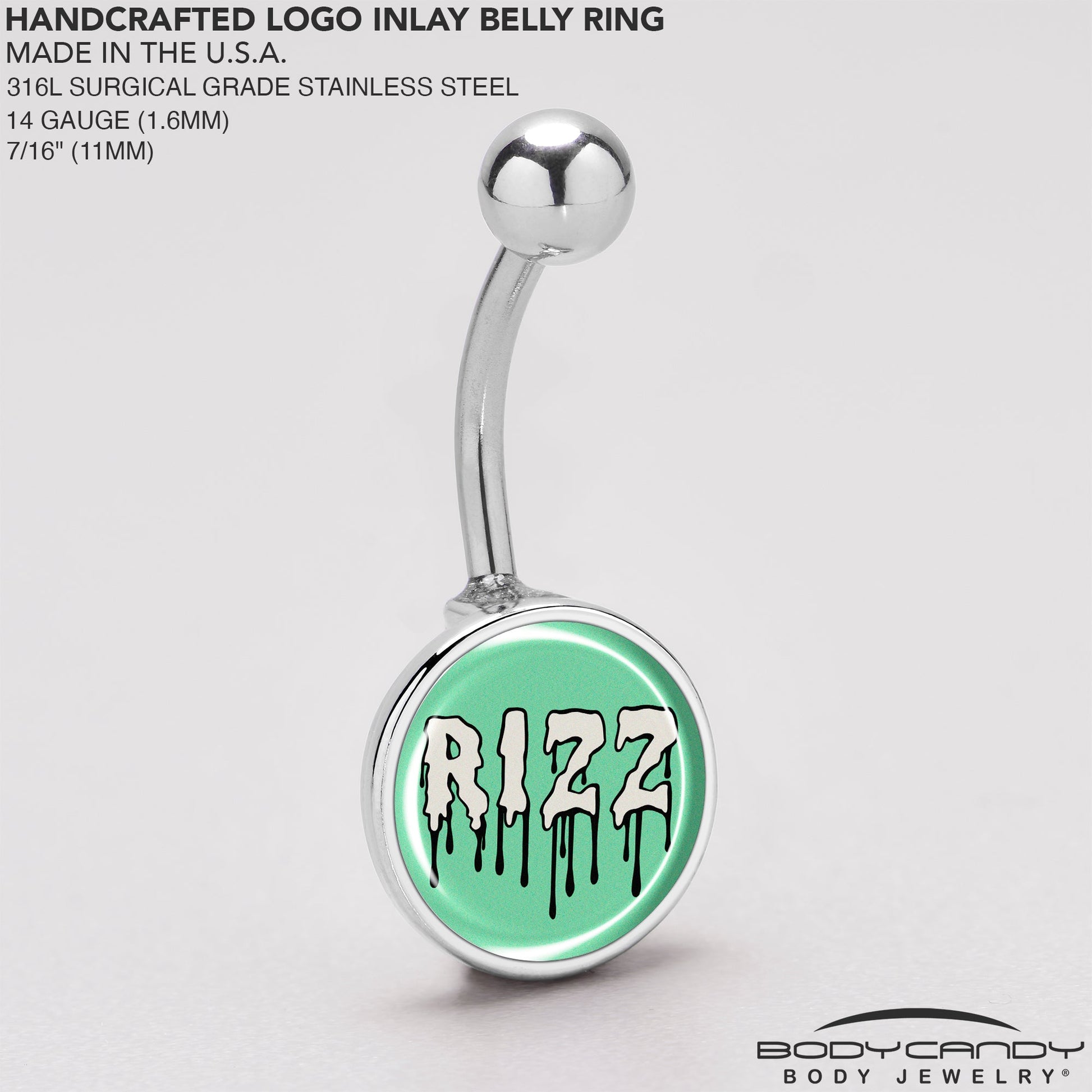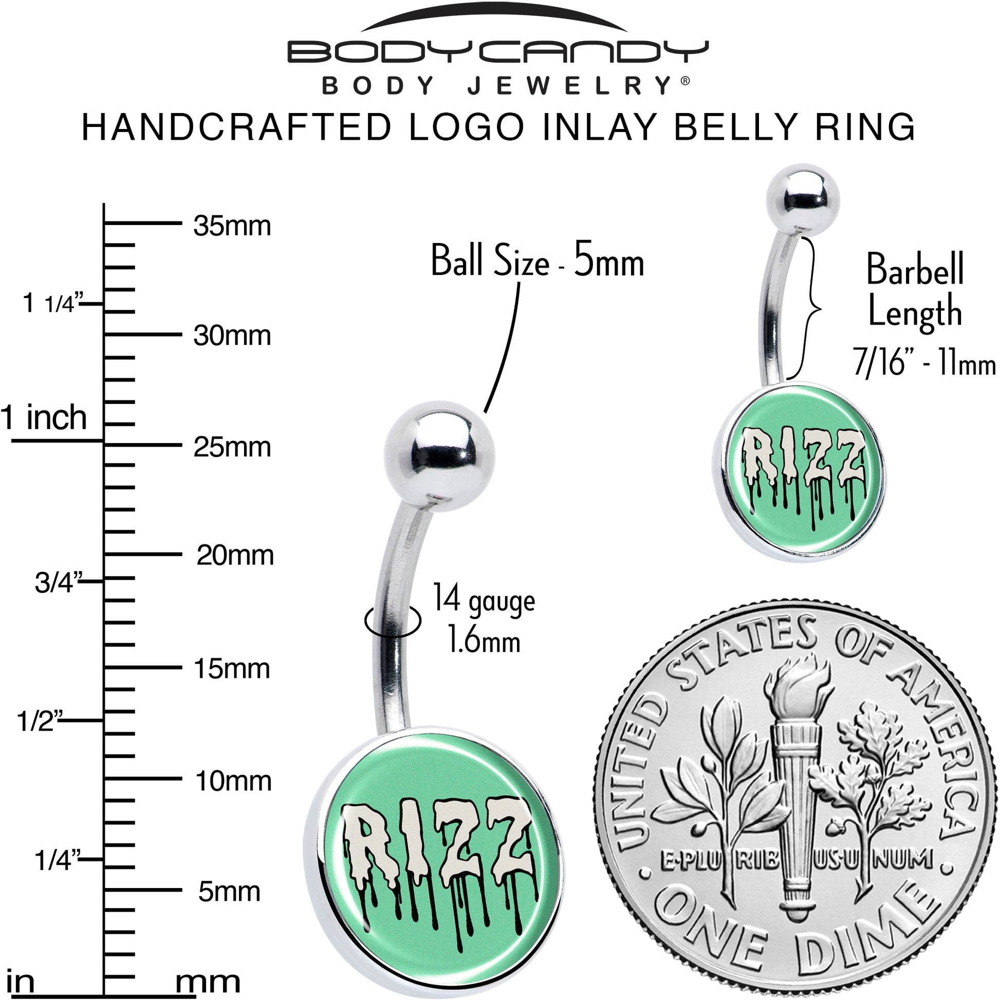 If you're dripping with rizz, show it off with this 14 gauge navel ring. It's made with a 7/16 inch 316L surgical grade stainless steel curved barbell with a 5mm top ball end. The bottom end features a disc shaped charm with the word rizz on it, in an eye-catching, drippy font. Let your charisma overflow with this whimsical slang belly piercing jewelry.
