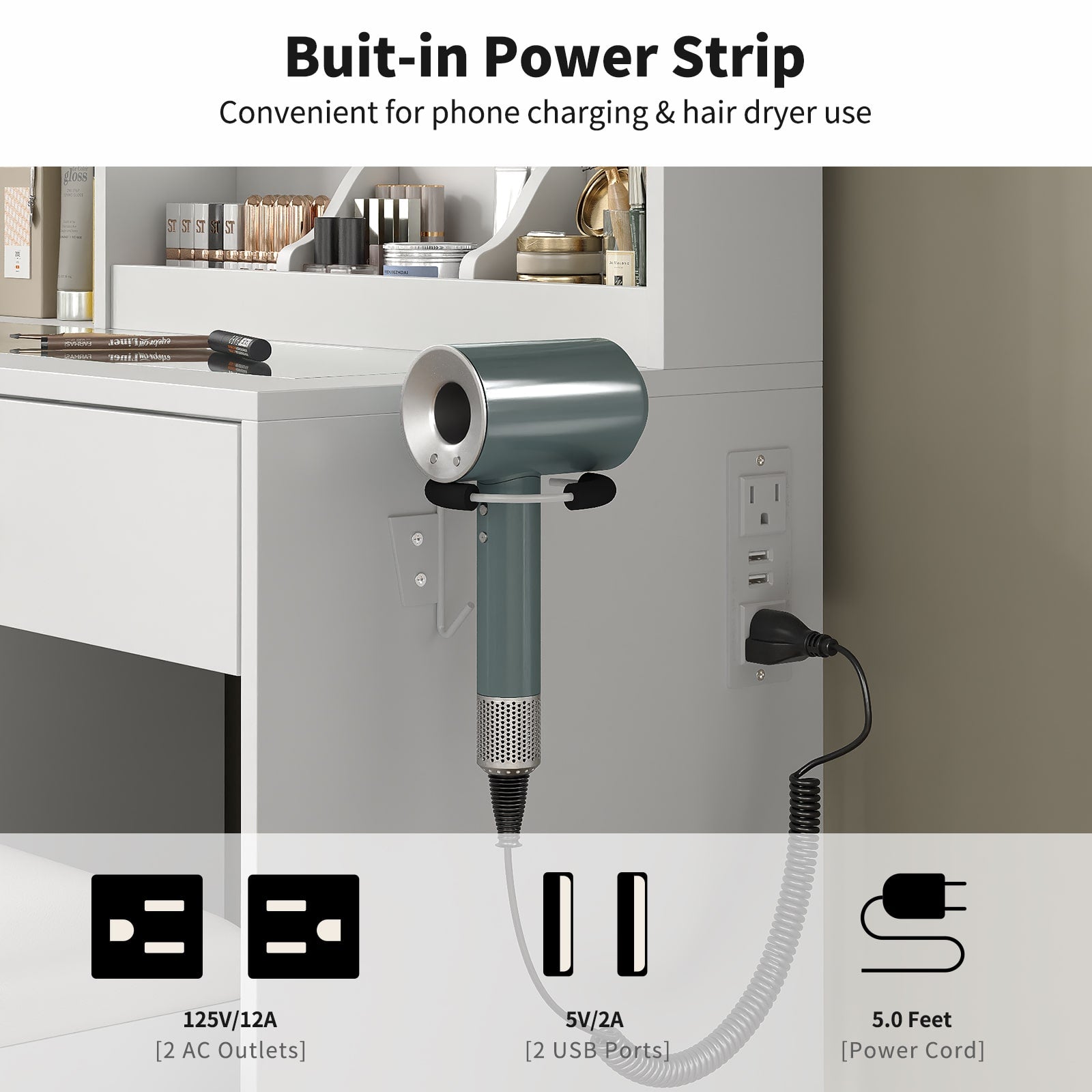 - Charging Station & Holder: This makeup vanity desk with lights is designed with a hair dryer holder and a charging station that includes two AC outlets and two USB ports, which makes it easier to connect your hair dryer, and curling iron or other mobile devices, and ensures you have a seamless and efficient beauty routine every day.
