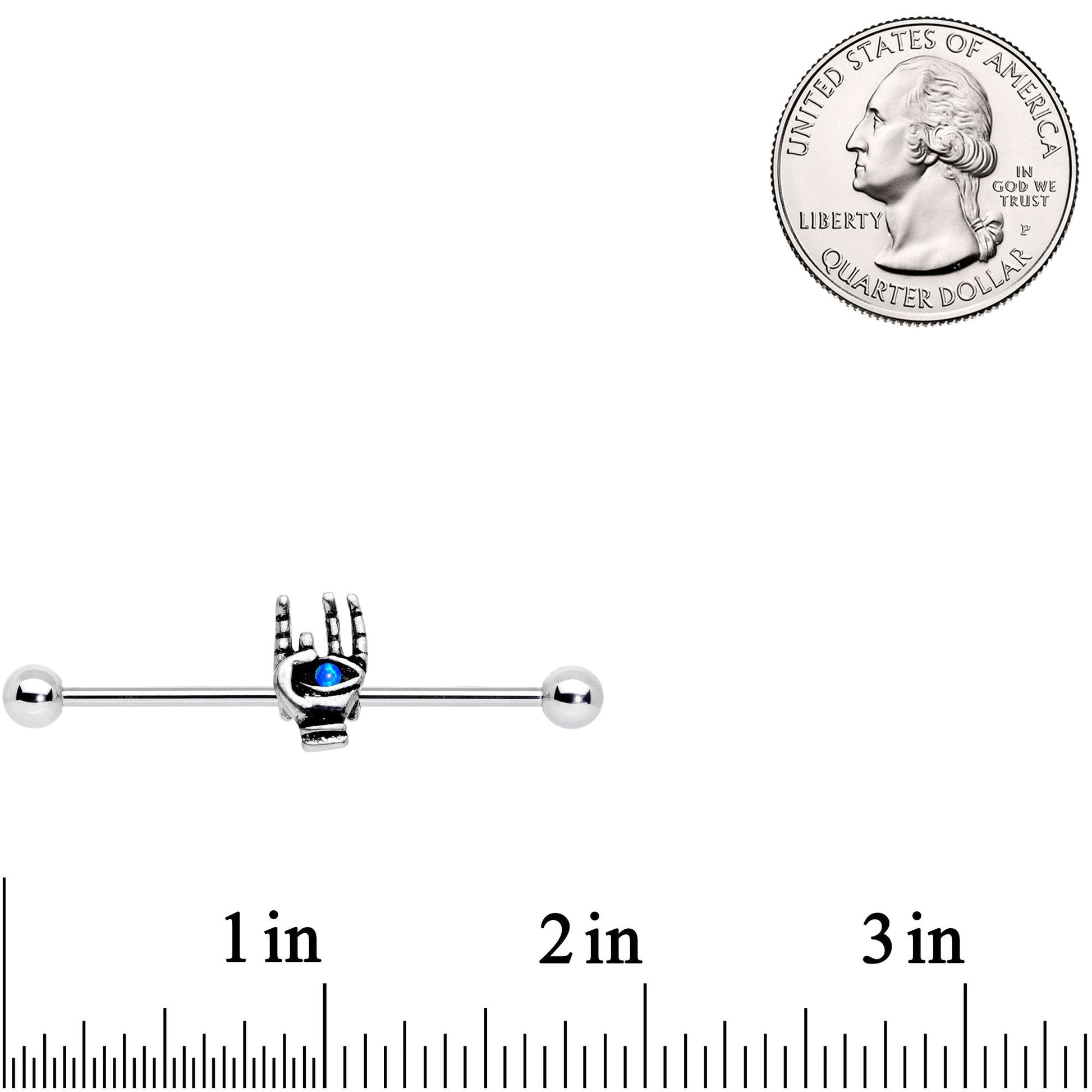 The Hamsa is said to protect one from the evil eye but the only eyes this charm will attract will be admiring ones! The moving charm is set on 316L surgical grade stainless steel straight barbell that is 14 gauge. The industrial barbell is a full 1 1/2" in length so there's plenty of space for the moveable Hamsa charm. And set in its palm is a stunning synthetic opal to add an unexpected bit of color to an otherwise monochrome piece. This is one Hamsa that is guaranteed to keep you from looking plain!Specifications