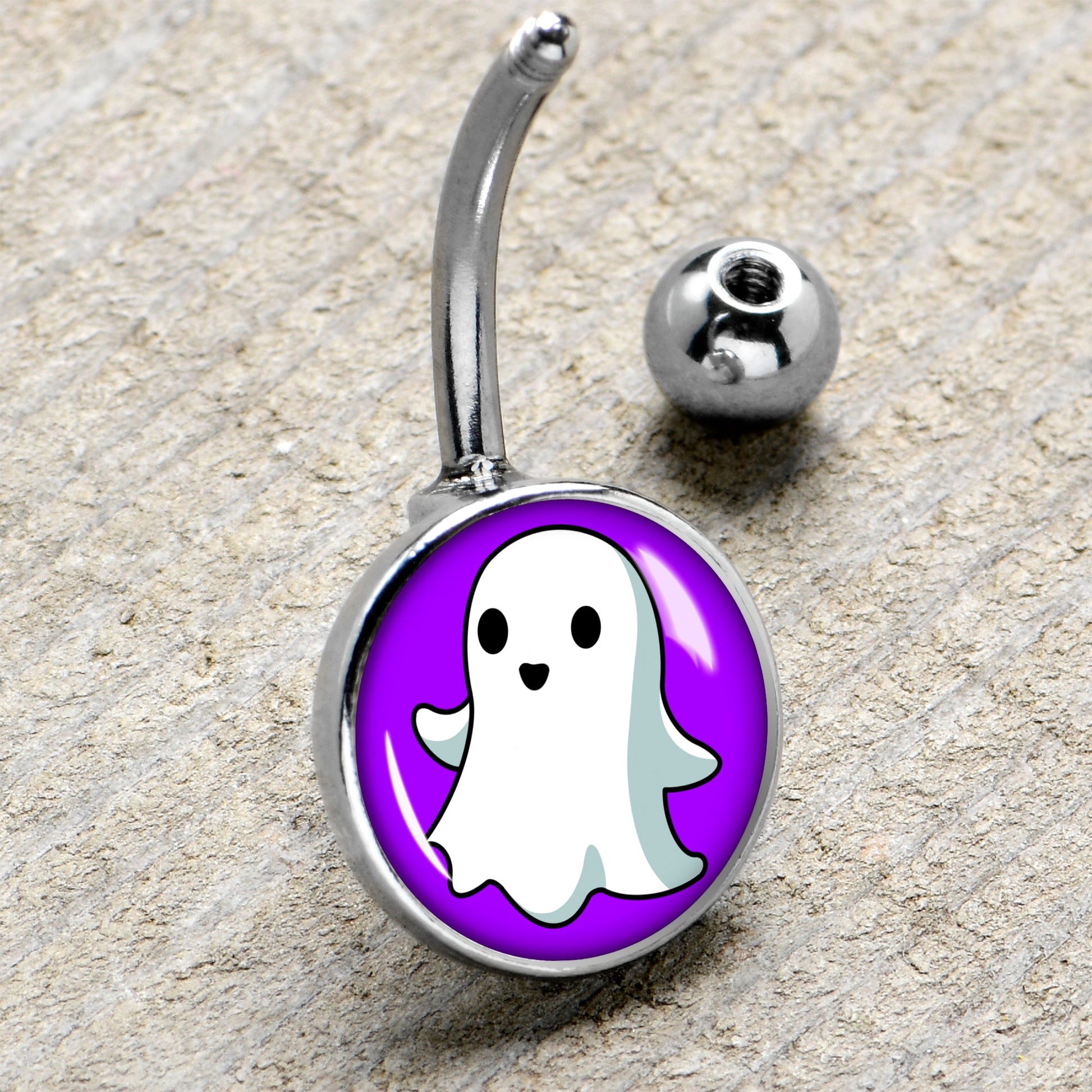 You will have nothing to boo about when you have on this 14 gauge navel ring. It is made with a 7/16 inch 316L surgical grade stainless steel curved barbell with a 5mm top ball end. The bottom end features a purple disc with a ghost on it. Despite being a spooky haunter, this ghost is wearing a friendly smile. Show the world that you are nobody to fear with the affable apparition on this belly piercing ring.