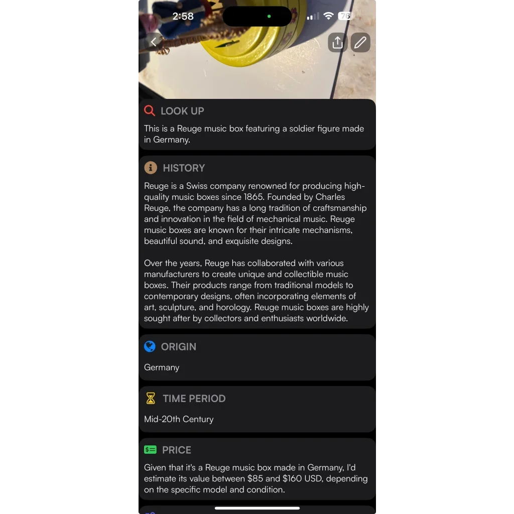The AI Scan reveals the full splendor of this exquisite Reuge music box, highlighting its near-perfect condition. Imagine the joy of owning a piece of musical history that's built to stand the test of time! While it's missing one red flower and a few leaves from the trees, these minor imperfections only add to its character and charm. The ingenious design allows you to wind it up from the bottom and control the melody with a simple pull of the side knob – it's music at your fingertips!