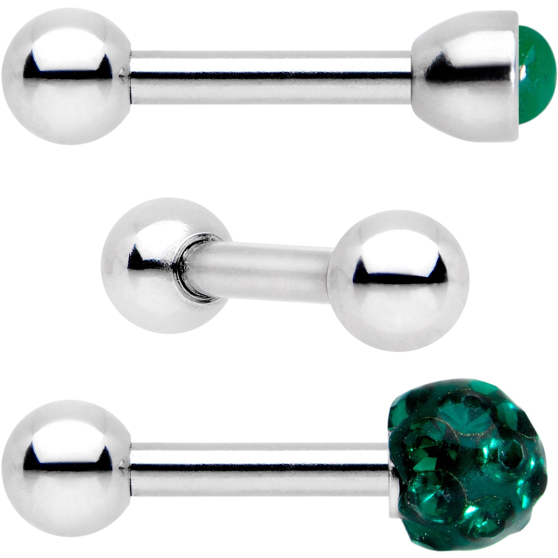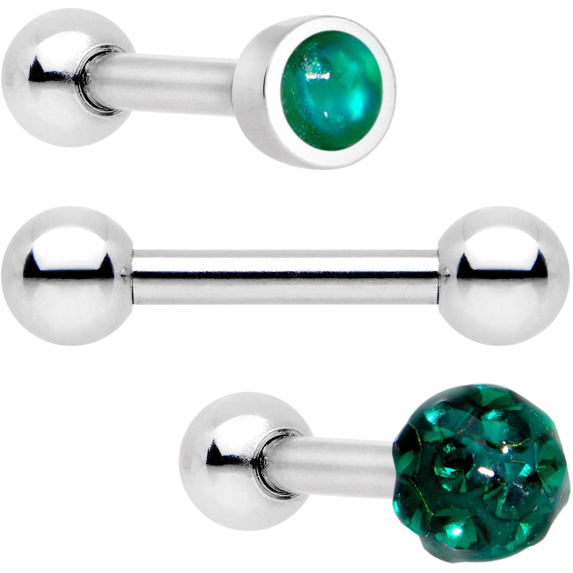 If you love options, then this is the perfect package of tragus and cartilage jewelry for you! This set of three 16 gauge straight barbells comes with one 3mm green gem cluster ball end, one green faux opal inlay, and four 3mm standard stainless steel balls