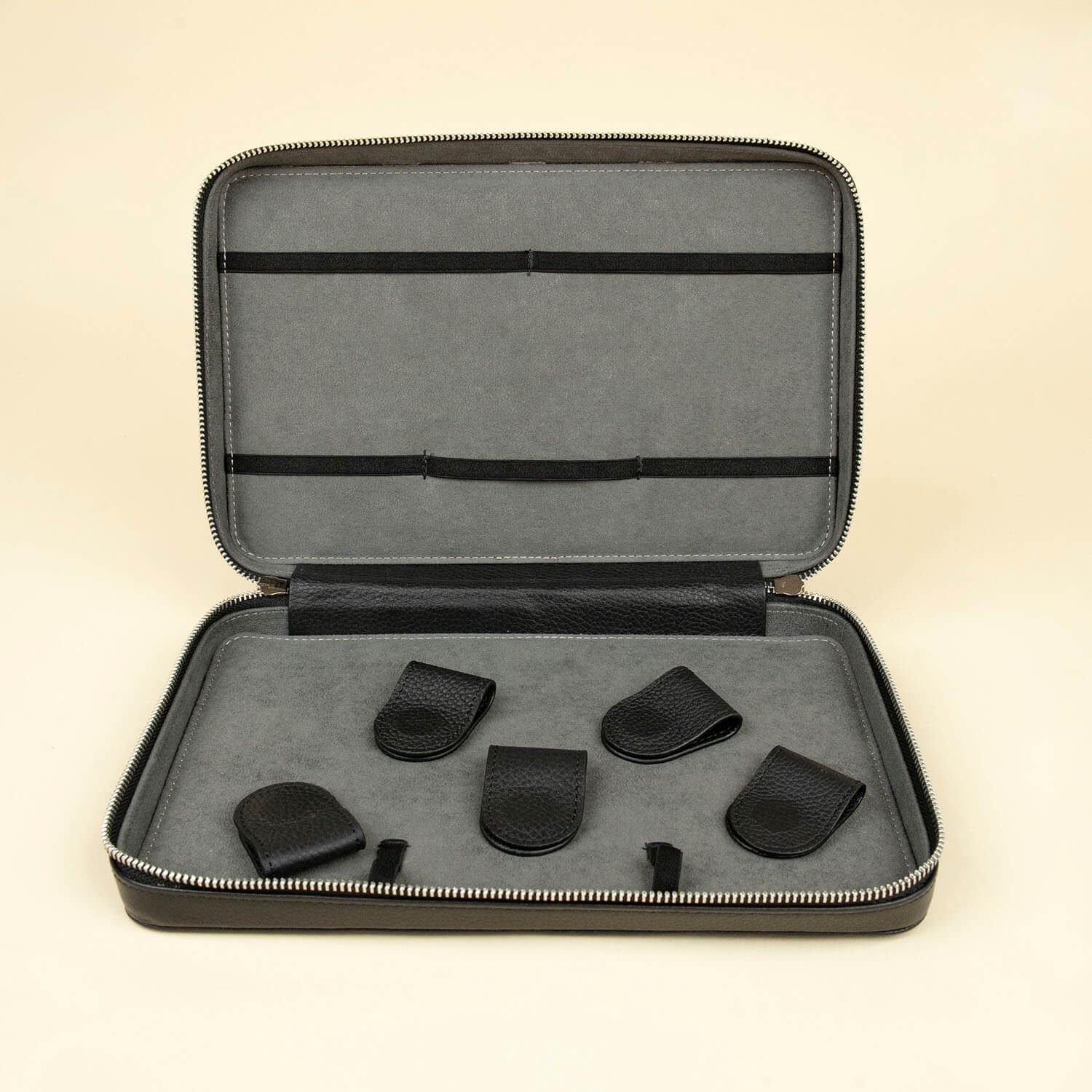 - The interior features elastic straps and compartments, providing customizable storage for adapters, earbuds, and styluses, ensuring everything stays in place.