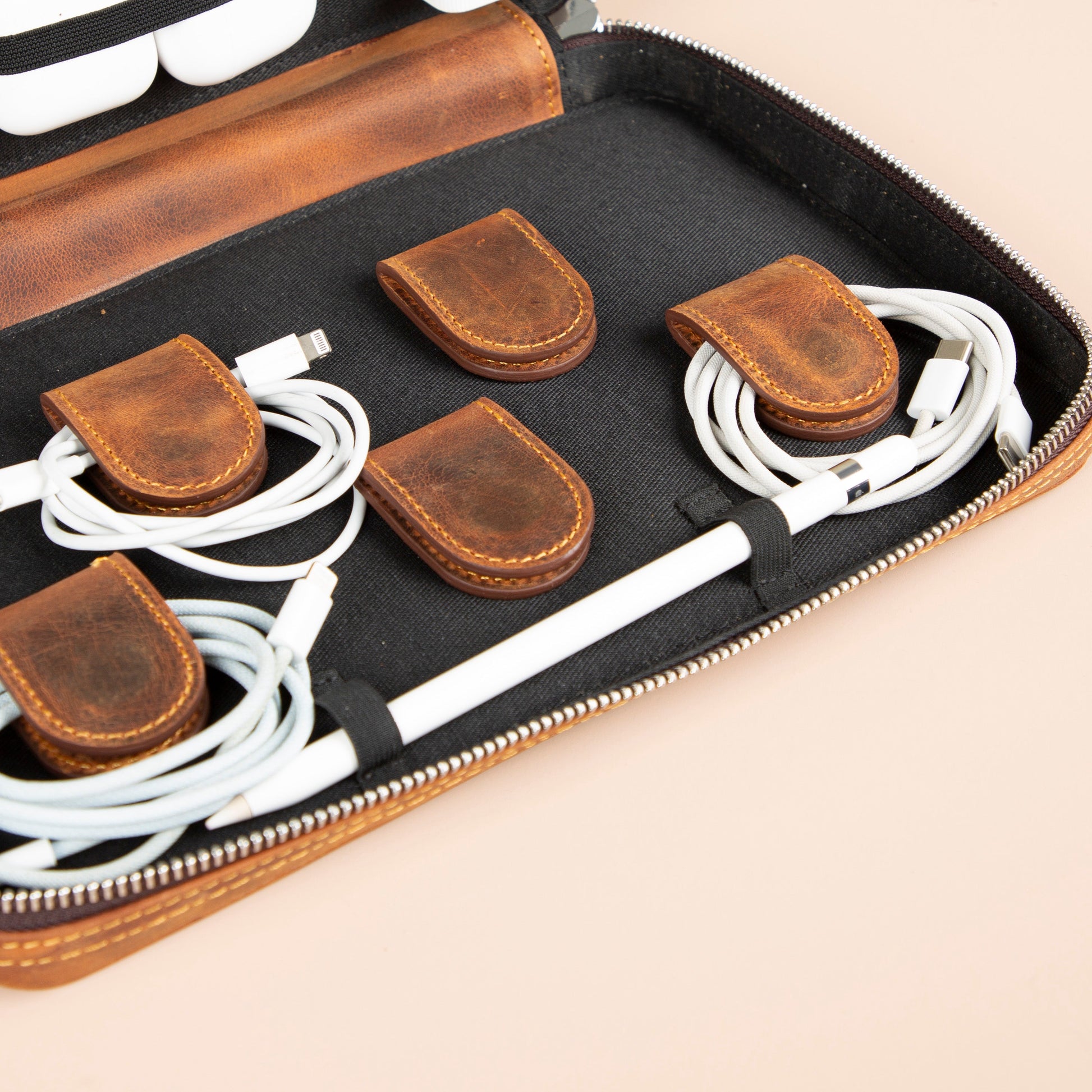 - Crafted from premium leather, it offers a sleek and durable solution for keeping chargers, cables, and other accessories neatly secured.