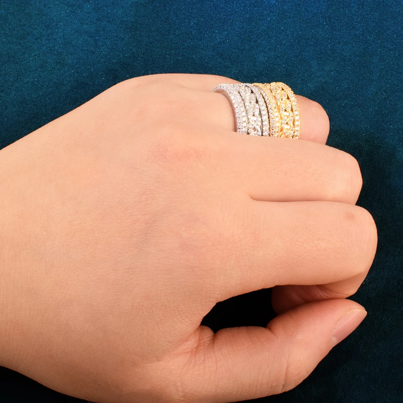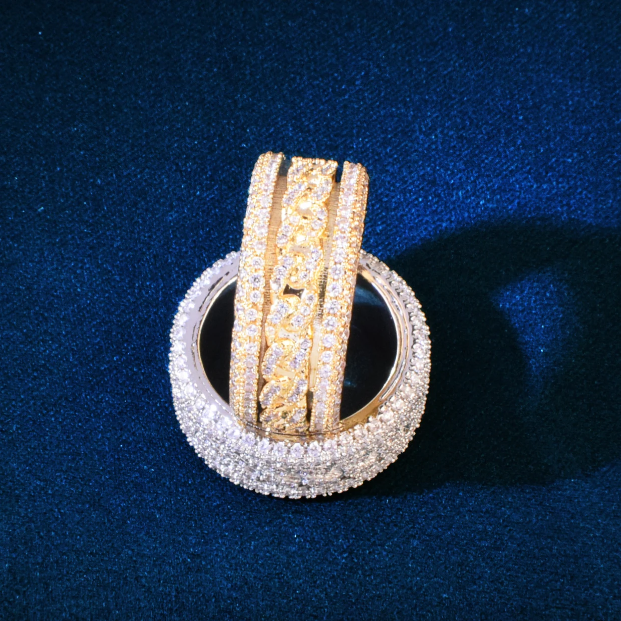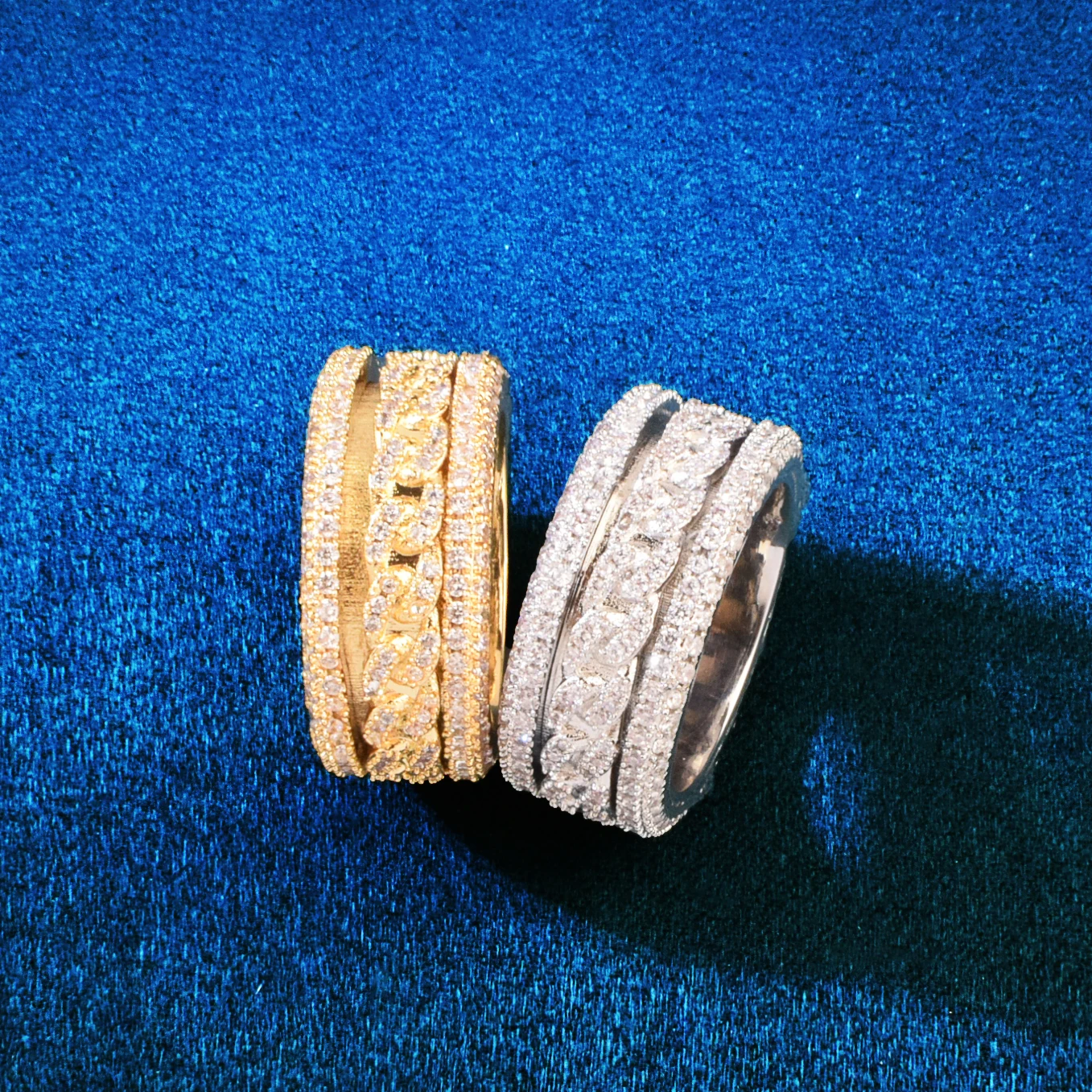 It doesn’t just shine—it spins. The Revolver Cuban Ring is pure outlaw energy forged into a 10mm metal riot. One twist and you’re hypnotized—each cubic zirconia catching light like a flashbang mid-solo. Gold or silver, this ring’s made for the kind of hands that grip mics, throttles, and destiny itself.