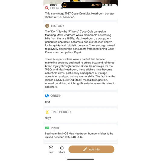 Retro Max Headroom Coke NOS Bumper Sticker Blast from the Past