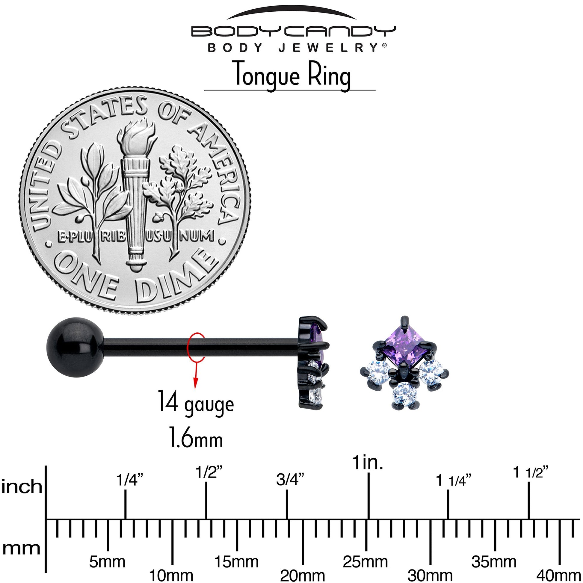 Your look is sure to be a hit when you are rocking this 14 gauge tongue jewelry. It is made with a 5/8 inch black PVD over 316L surgical grade stainless steel straight barbell with a 6mm bottom ball end. The top end features an elegant rhombus charm, with a purple cubic zirconia gem center and a trio of clear cubic zirconia gem embellishments for a color contrast you can not take your eyes off of. Make an impact with this elegant rhombus tongue piercing ring.